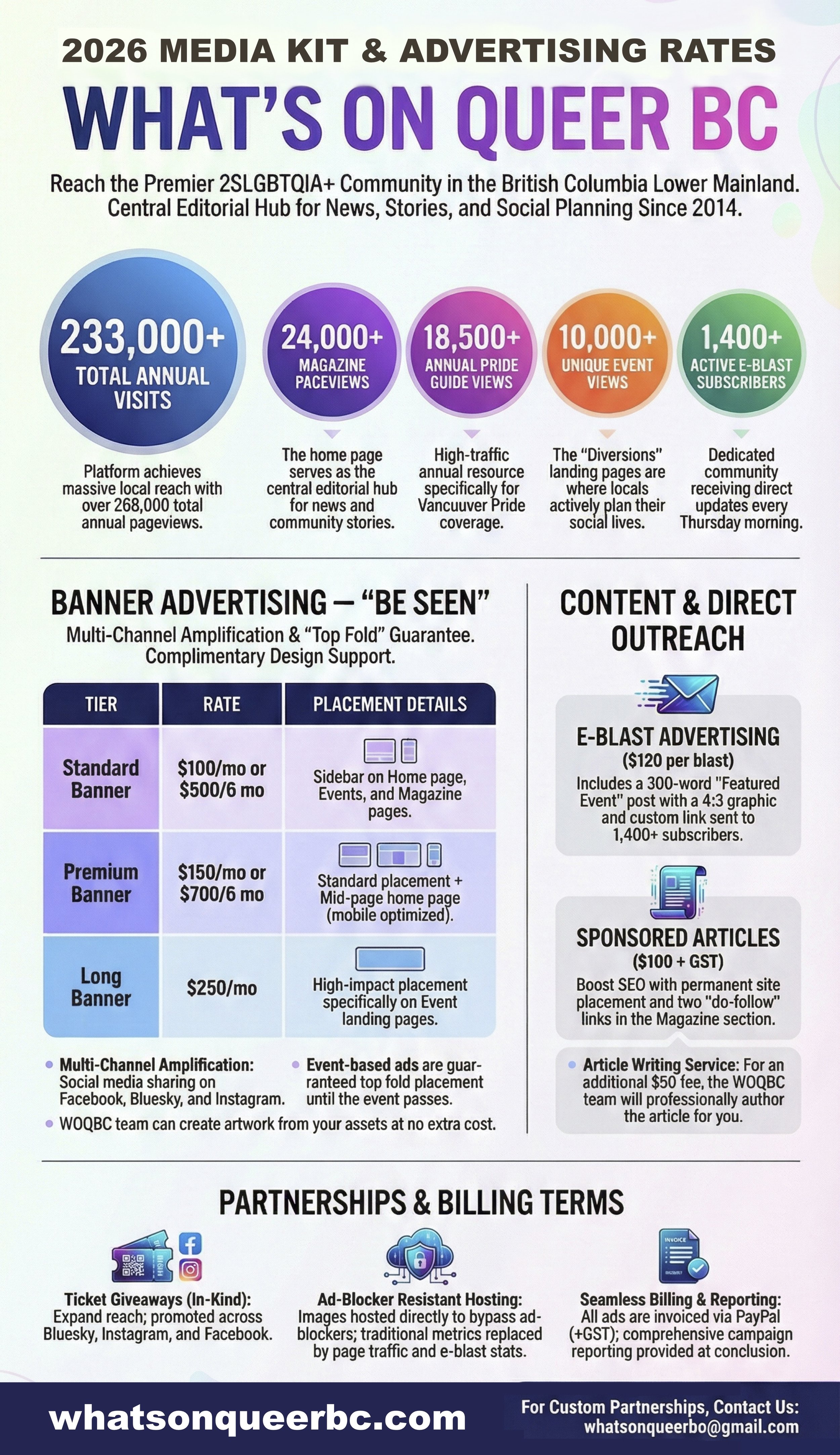 Below is our 2026 Media Kit and Advertising Rates (or click here). Please feel free to connect with us, Karin Shard (Marketing) or Jude Goodwin (Publishing) if you’d like to take advantage of any of these opportunities! Our email is whatsonqueerbc@gmail.com