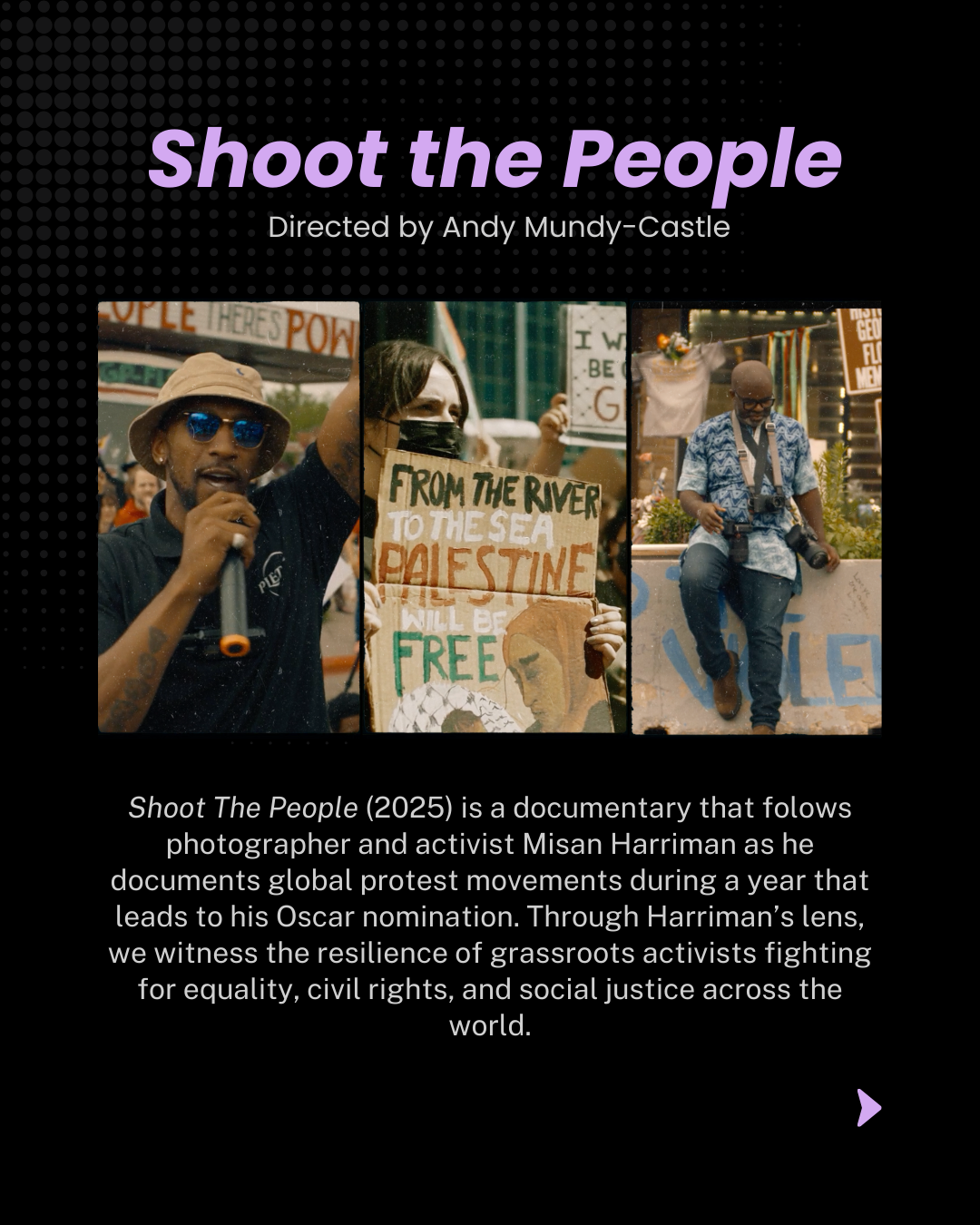 Shoot The People is a documentary that follows photographer and activist Misan Harriman as he documents global protest movements during a year that leads to his Oscar nomination. Through Harriman’s lens, we witness the resilience of grassroots activists fighting for equality, civil rights, and social justice across the world.