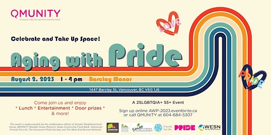 This event is made possible by the collaborative efforts of Gordon Neighbourhood House, QMUNITY, Roedde House Museum, Saige Community Food Bank, Vancouver Friends For Life, The Vancouver Pride Society, and The West End Seniors Network.