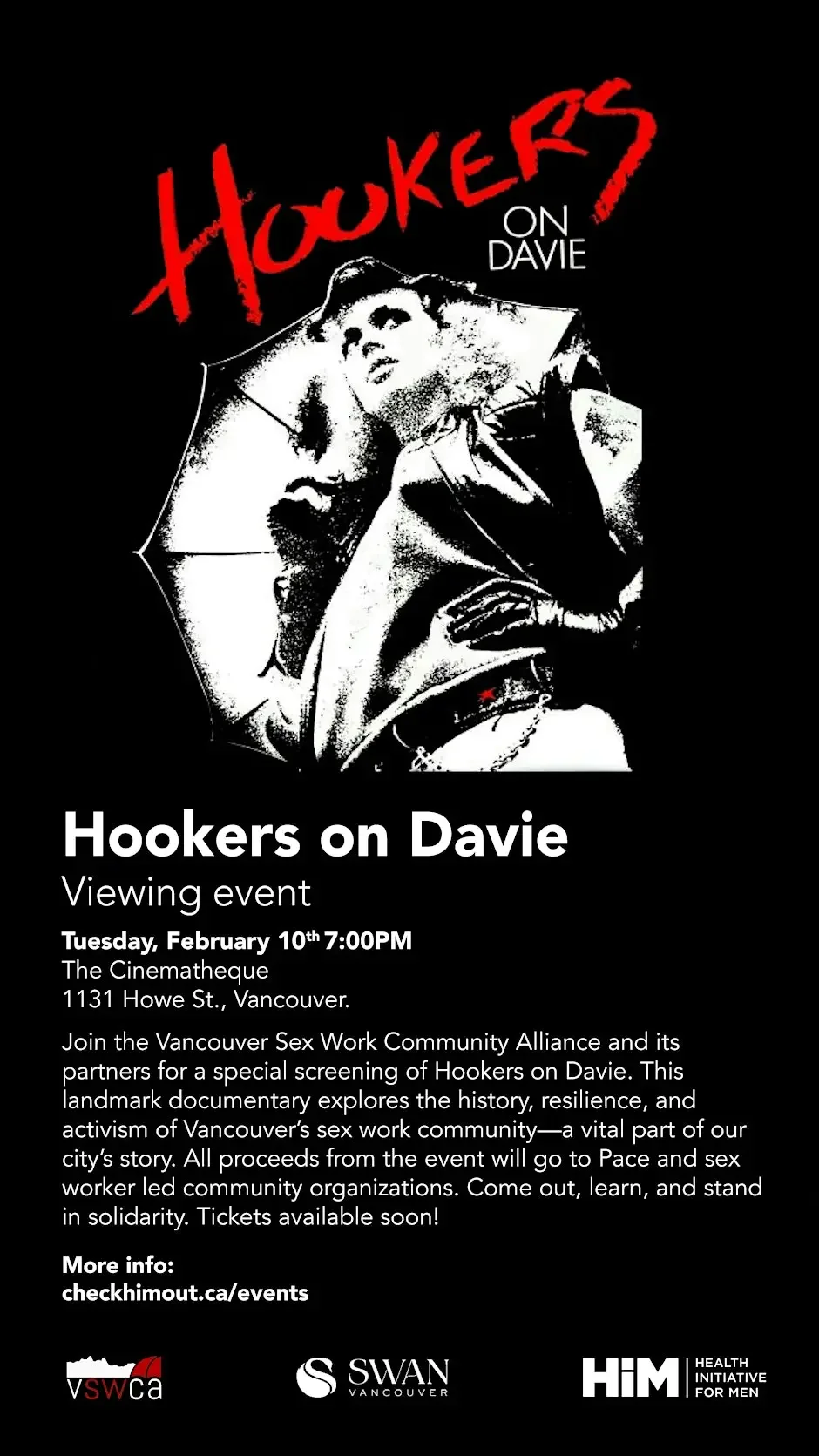 Join us in person for the Hookers on Davie screening and fundraiser – come out, learn and stand in solidarity. Doors open at 6:30