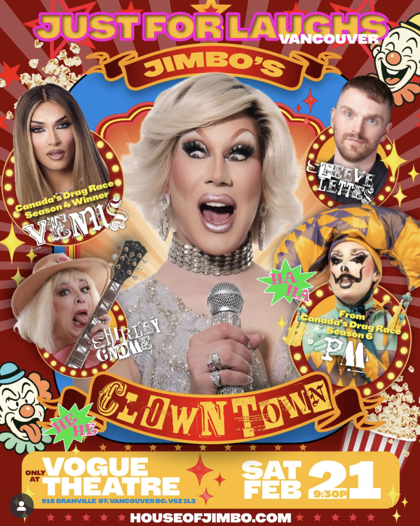 Step right up for JIMBO’s Clowntown, a wild, glitter-fueled spectacle presented by Just For Laughs Vancouver. Hosted by international drag sensation and RuPaul’s Drag Race All Stars 8 winner JIMBO the Drag Clown, this comedy circus brings together a lineup of bold and hilarious acts including Bearded Lady (@pmforagoodtime), Big D!ck Girl and Canada’s Drag Race Season 4 winner Venus (@legallyvenus), musical mischief-maker Shirley Gnome, and comedian Steev Letts.