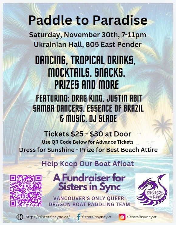 Escape to a tropical paradise and summer in November! Sisters in Sync, Vancouver's only queer dragon boat team, is hosting a fundraising event that promises a night of fun and community spirit. Dress in your best beach attire and compete for the coveted "Best Beach Look" prize while sipping tropical drinks, mocktails, and delicious snacks. Exciting entertainment featuring drag king Justin Abit and the spectacular samba dancers, Essence of Brazil, followed by a dance to let your hair down with music by DJ Slade! It’s the perfect way to shake off the winter blues and support a great cause. Join us for a night of fun, friendship, and fabulousness, and help us raise funds to Keep Our Boat Afloat!