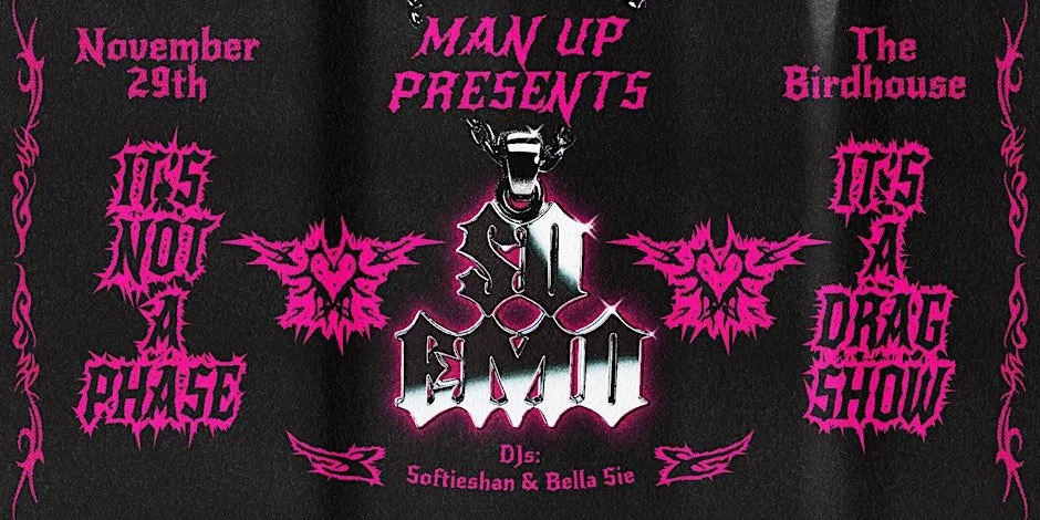 SO EMO - it’s NOT a phase - it’s a drag show. Nov 29th write sins, not tragedies ~ come scream-sing along as we drag up fav emo classics. Nov 29.