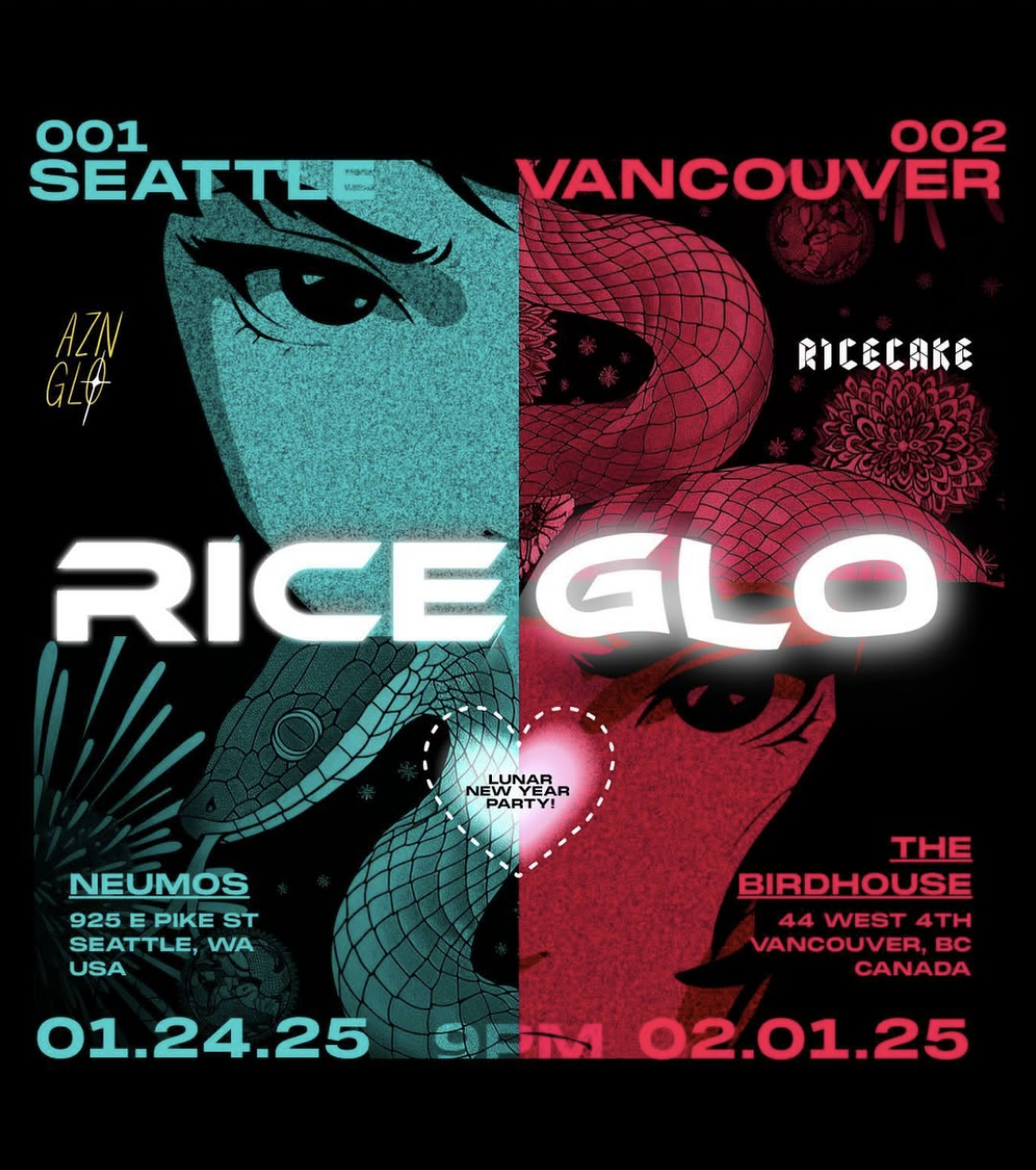 Prepare for double happiness! Lunar New Year 2025 is starting off with a two-part party collab powered by Ricecake (YVR) and AznGlo (SEA). Jan 24. Feb 1.