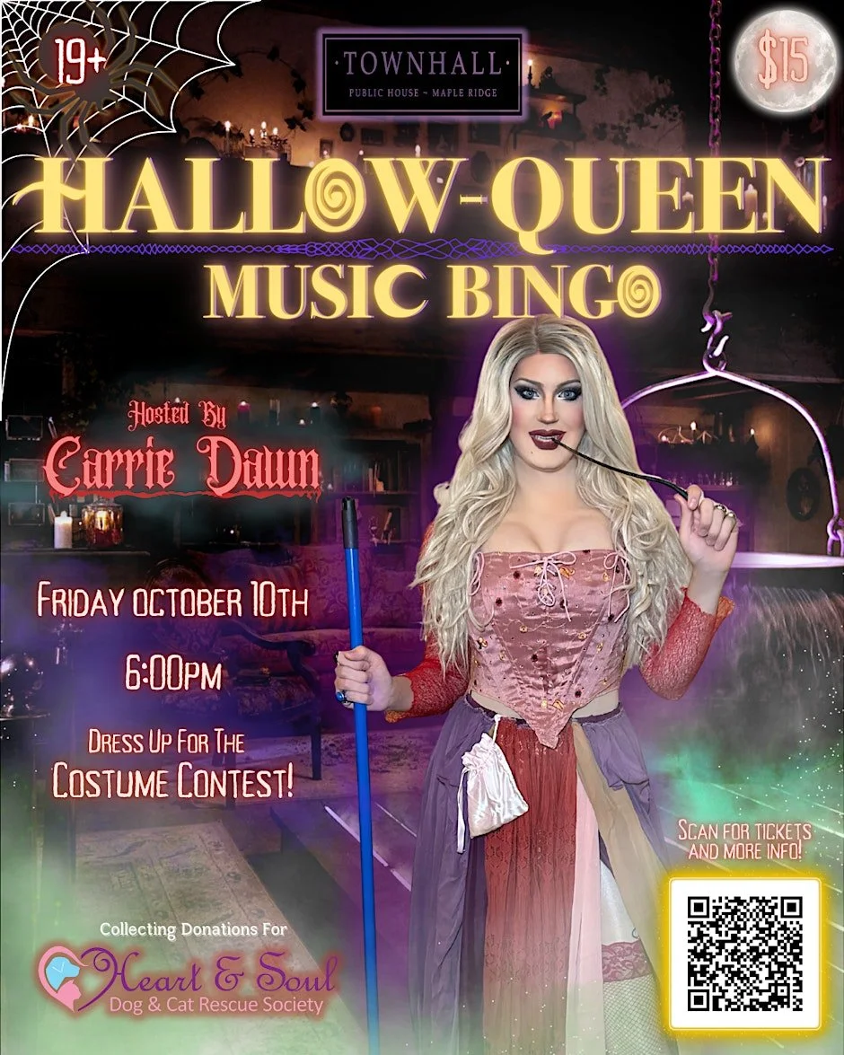 Join us for a Spook-tacular Night of Music Bingo Halloween style! Hosted by the Queen of Halloween, Drag Queen "Scary" Carrie Dawn! Oct 10.