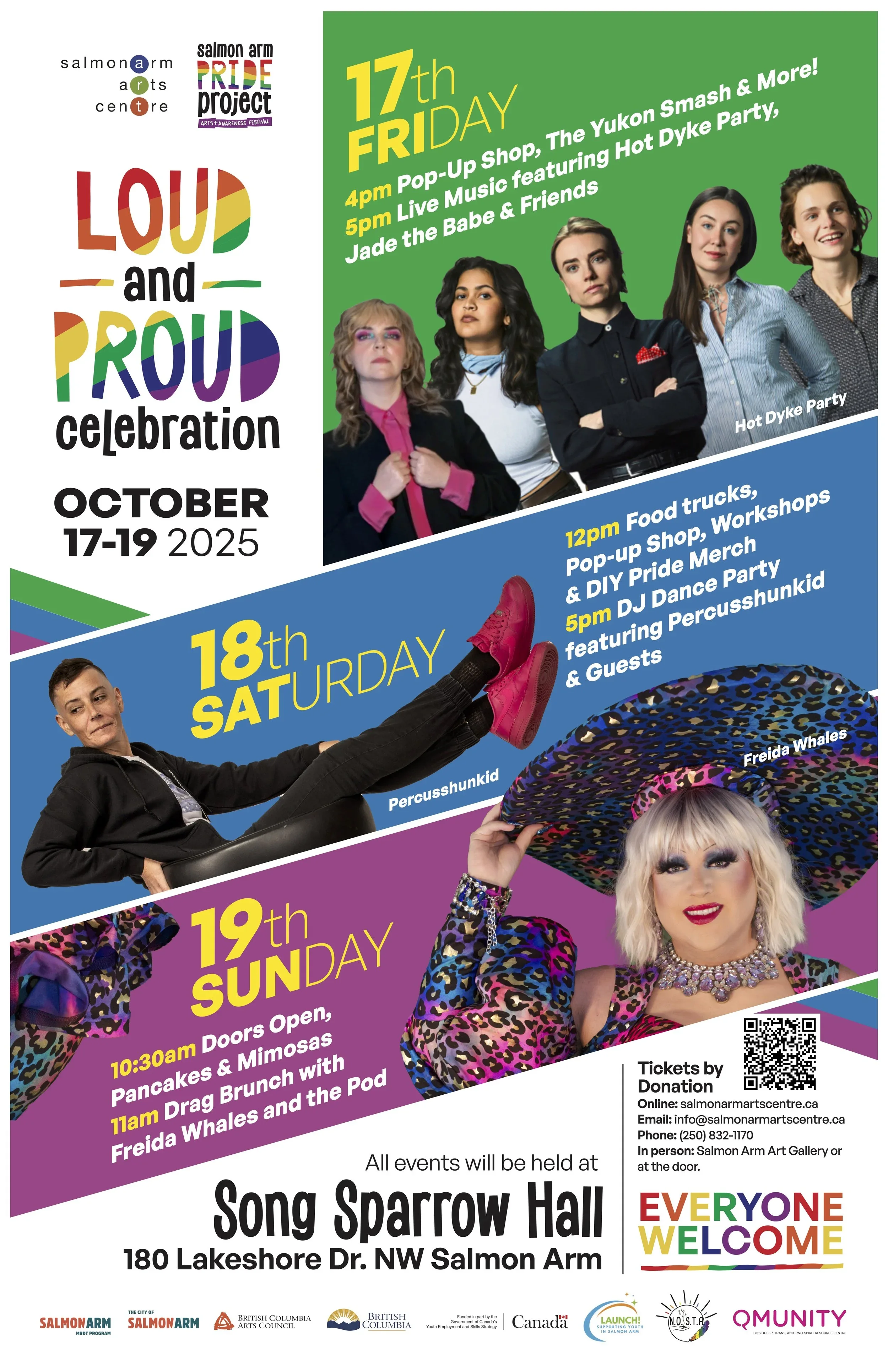 The Salmon Arm Pride Project presents the Loud and Proud Celebration at Song Sparrow Hall. The weekend includes live music, food trucks, workshops, a DJ dance party, and a drag brunch with Freida Whales and the Pod. Oct 17-19.