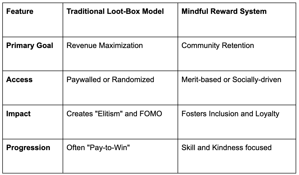 Fair Play: Focuses on transparency and choice. Rewards are earned through clear milestones, and purchases are limited to cosmetic items that do not provide a competitive advantage.